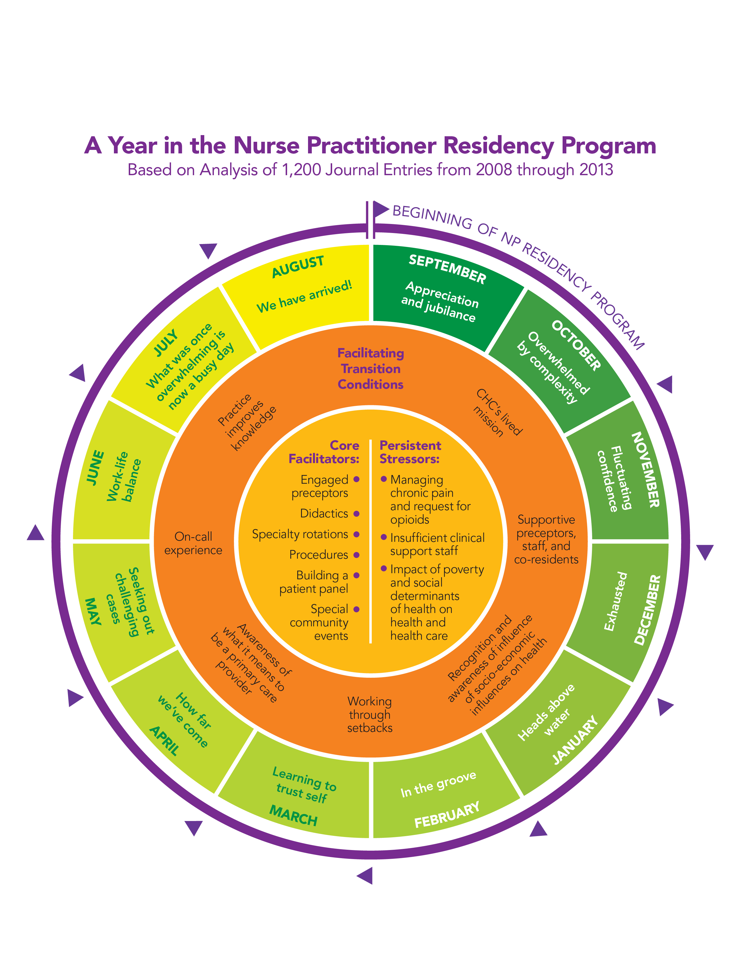 Flinter and Hart created a wheel of month-by-month progress that describes the transition from trainees, “feeling shocked and overwhelmed to becoming confident, competent primary care providers, committed to under-served populations.”